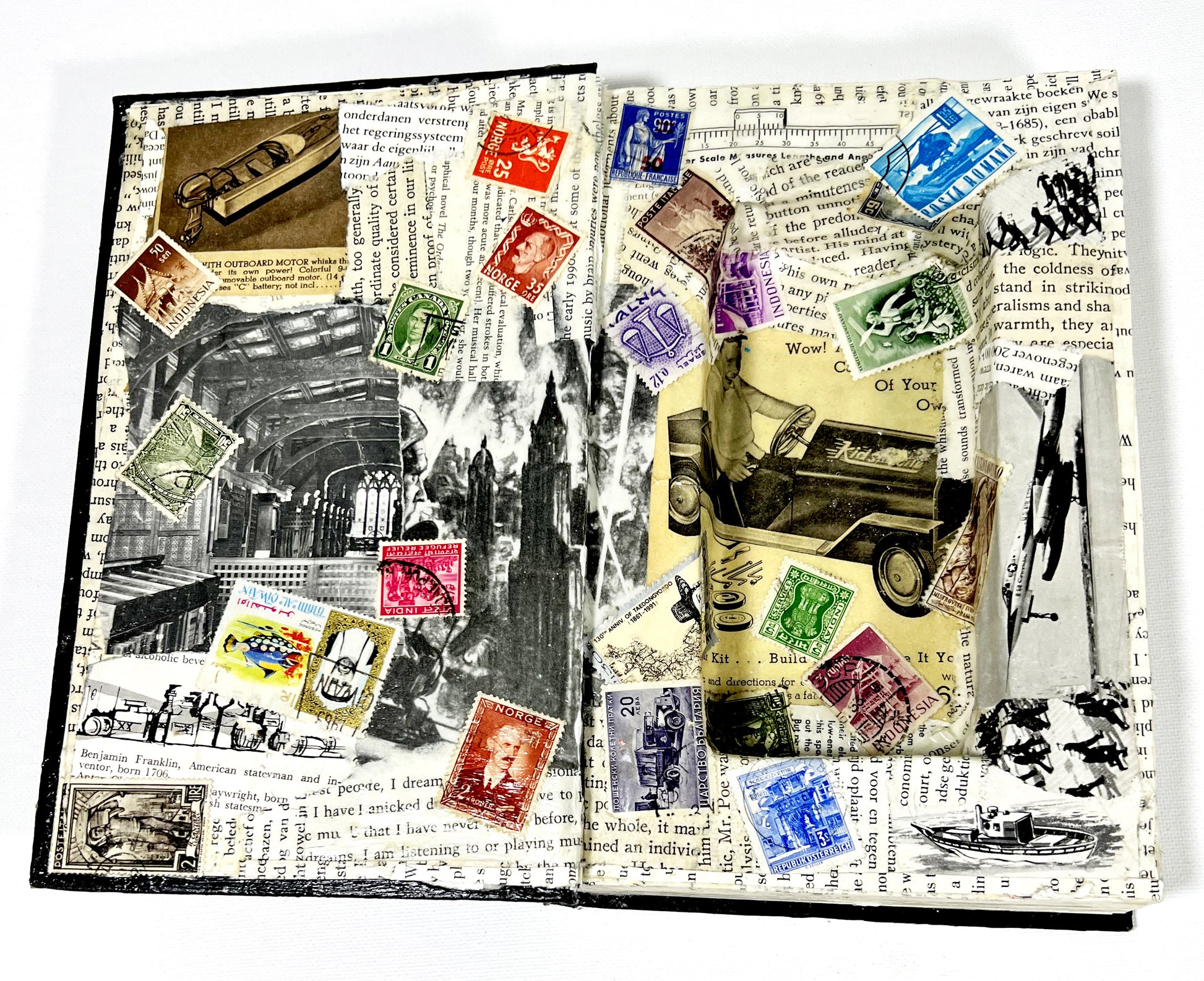 - Vintage book with a secret hiding spot - Inside decoupaged with vintage stamps, and random pages.