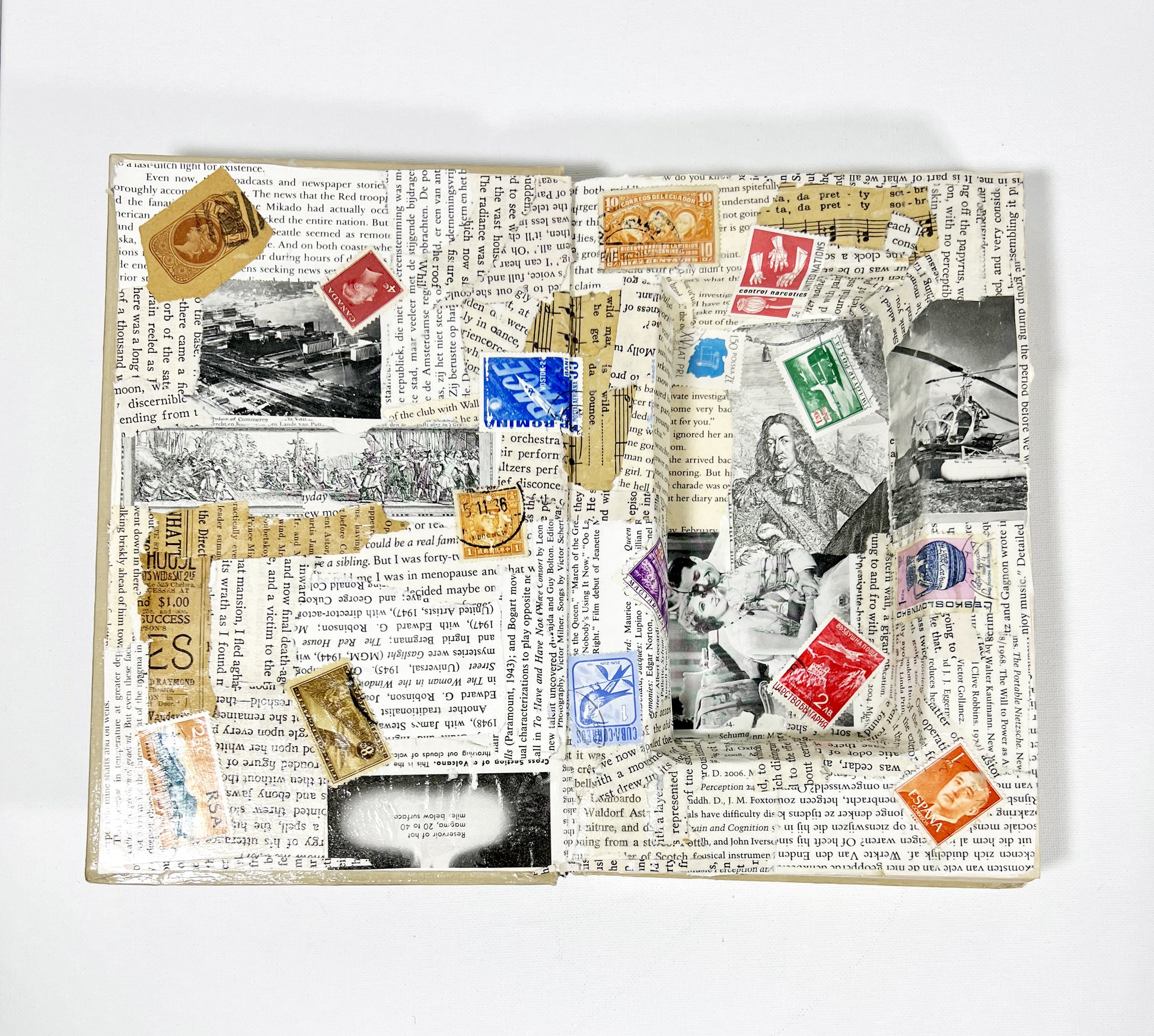 - Vintage book with a secret hiding spot - Inside decoupaged with vintage stamps, and random pages.